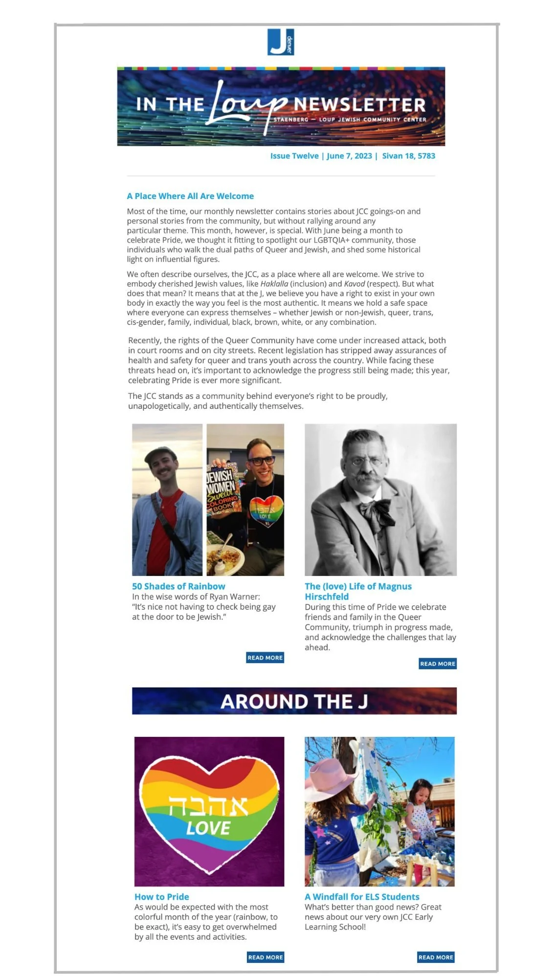 It’s impossible to ignore the threats perennially aimed at the LGBTQIA+ community worldwide. For the June 2023 newsletter, I was given the chance to craft a letter to our community, communicating the JCC’s sentiments.